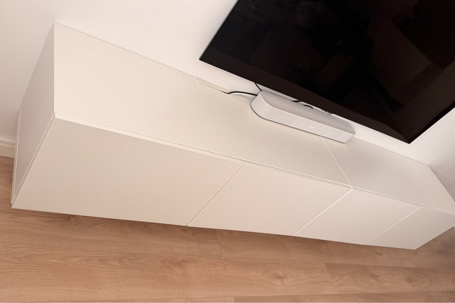 TV-bänk i vit färg. Bänken har fyra fack med luckor. Den är vägghängd. Monteras i två delar.