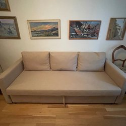 Säljer en praktisk bäddsoffa. Den är lätt att fälla ut till en säng och har förvaringsutrymme under sitsen. Perfekt för gästrummet eller som en platsbesparande lösning i mindre lägenheter. Mått: 200 cm x 140 cm (utbäddad).