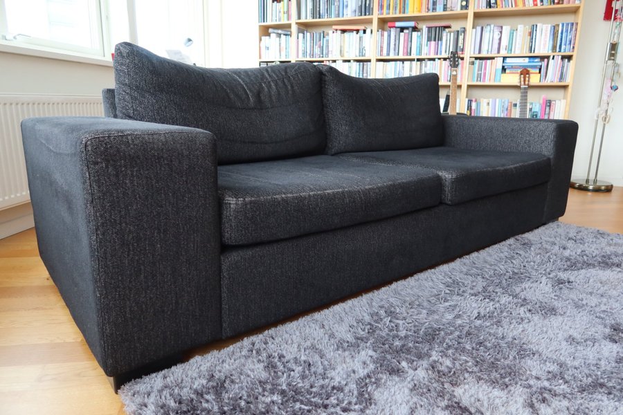 Soffa med två sittplatser. Klädsel i mörkgrått tyg. Passar bra i vardagsrummet eller allrummet.