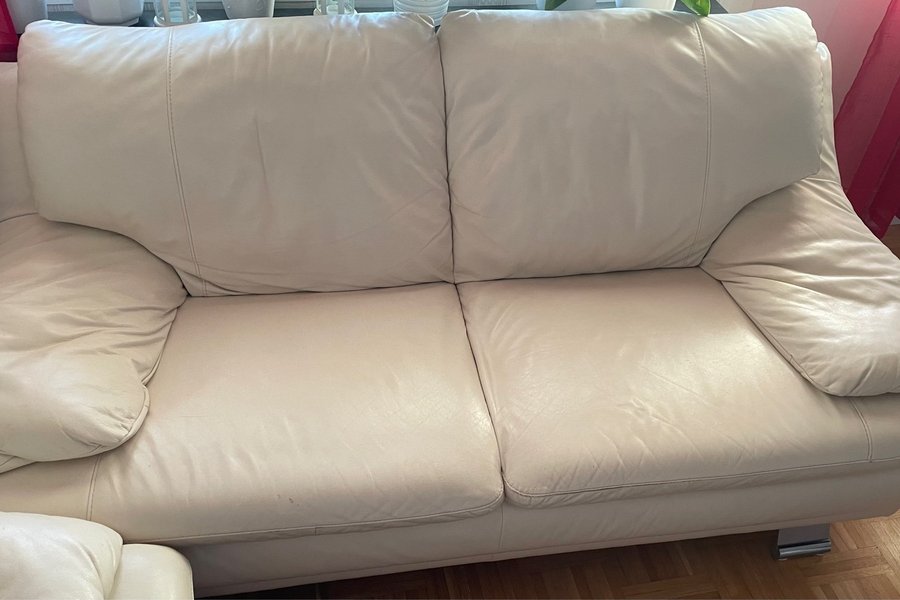 Soffa i ljust läder med två sittplatser. Soffan har armstöd och ryggstöd. Benen är i metall. Hämtas senast söndag 16/2 kväll.