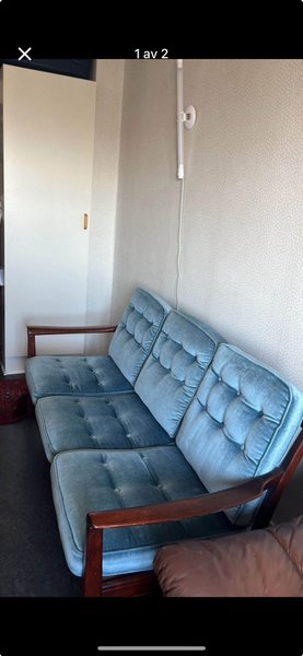 En fin retro soffa med blå sammetsklädsel och trädetaljer. Perfekt för dig som älskar vintage möbler. Mycket skön och är dessutom i gott skick. Längd 175 cm. Bredd 68 cm. Djup 45 cm. Hör av dig vid intresse!
