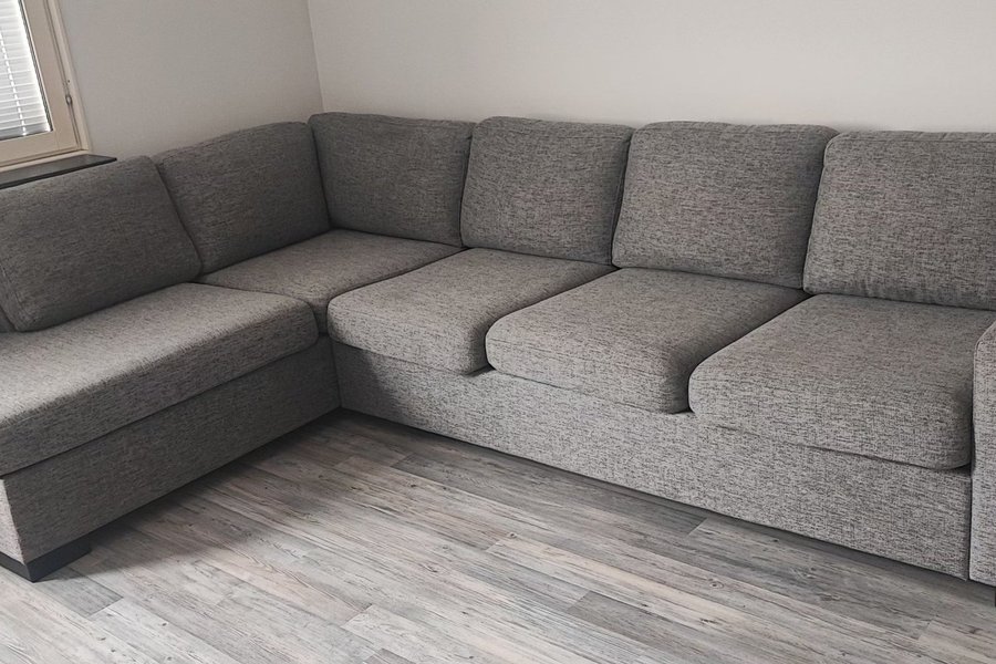 Hörnsoffa med tygklädsel i grått. Soffan har en L-formad design med en divan på vänster sida när man sitter i den. Den har lösa sitt- och ryggkuddar.