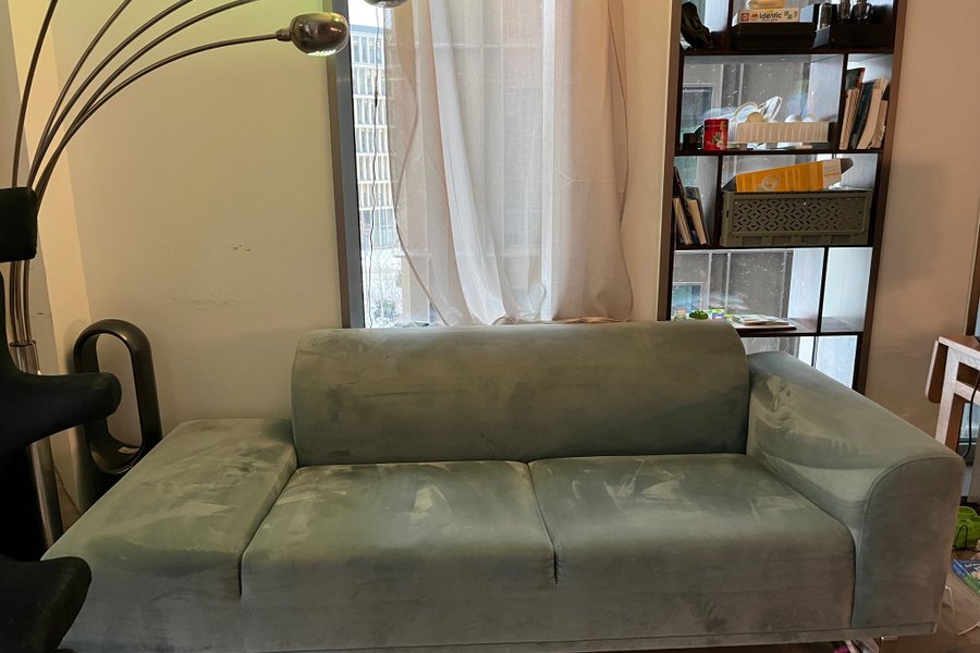 Soffa med sammetstyg i ljusgrön färg. Soffan har två sittplatser och raka armstöd. Benen är i metall. Soffan är ungefär 2 år gammal.
