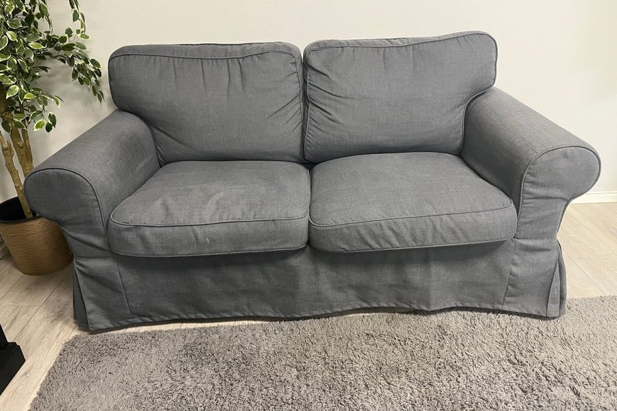 Soffa med två sittplatser. Klädsel i grått tyg. Avtagbar klädsel.