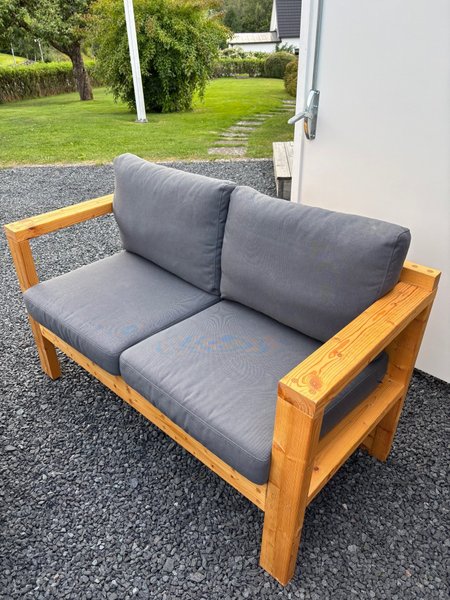 Soffa i trä med grå dynor. Soffan har en stomme i trä och två sittplatser. Dynorna är avtagbara. Mått 140x65 cm