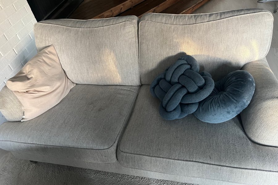 Soffa med två sittplatser. Klädsel i grått tyg. Två kuddar medföljer, en ljusbeige och en blå knutkudde.