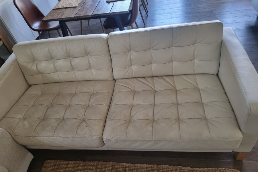 Soffa med klädsel i vitt läder. Soffan har en design med tuftade dynor och raka armstöd. Benen är i trä.