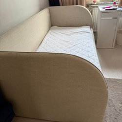OAKDALE MIN barnsoffa har ett slitstarkt sammetstyg och en stabil stomme av furuträ och plywood med god sittkomfort tack vare sin fantastiska uppbyggnad av kallskum, zickzack fjädring, resårband samt den sköna polyesterstoppningen. Ben av guldfärgad mässing och vackra detaljer i ryggen. Storlek: Höjd 57 cm, bredd 120 cm, djup 50 cm. Frihöjd uner möbel: 15 cm. Maxvikt: 90 kg. Mycket fint begagnat skick.