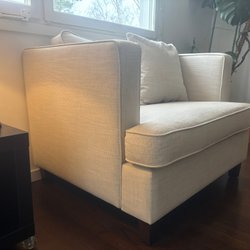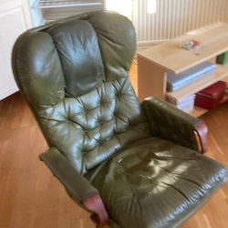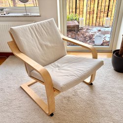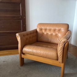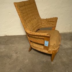 Fin och bekväm fåtölj med avtagbar överdel. Inga defekter på tyget men träet kan ha små skavanker. Den går nog att bli målad för att bli extra fin.