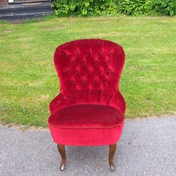 Emma-fåtölj i gammelrosa i typ sammet/velour med knappdetaljer i ryggen.