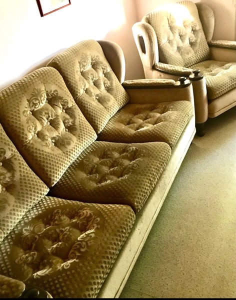 Soffgrupp bestående av en tresitssoffa och en fåtölj. Möbelklädsel i mönstrat tyg med knappar. Armstöd i trä.