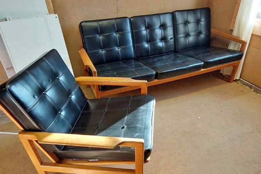 Soffgrupp från 60-talet bestående av en tresitssoffa och en fåtölj. Stomme i trä och klädsel i svart konstskinn/galon med knappar. Osäker på träslaget. Men liknar ek.