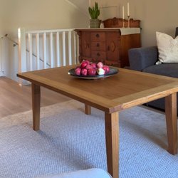 Ett vackert soffbord i ek med trästruktur. Bordet har en robust design och en stabil bas.
