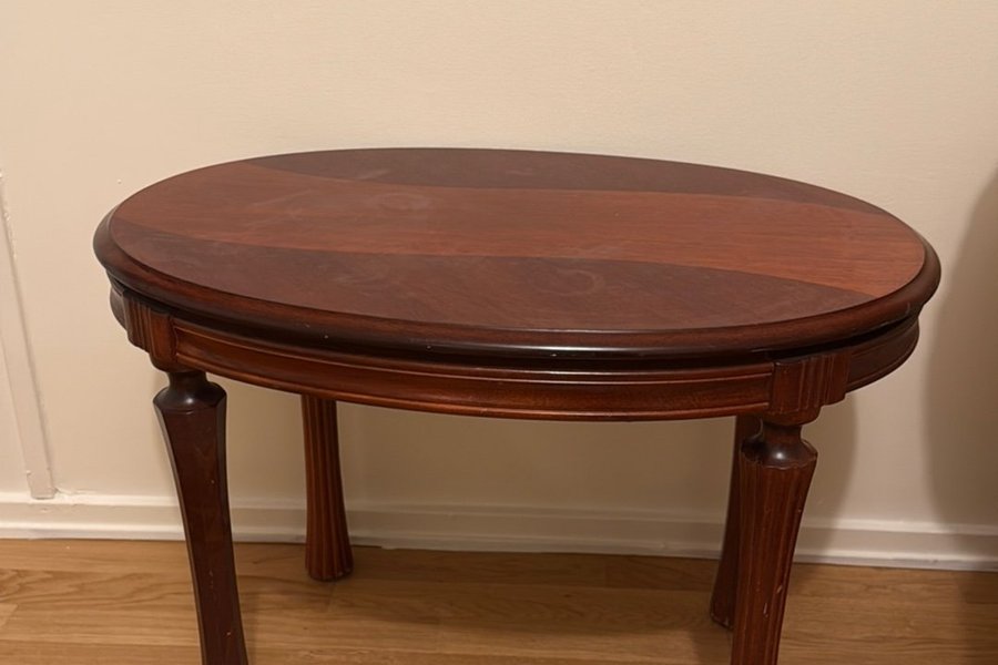 Ett klassiskt bord med oval bordsskiva och svarvade ben. Passar bra som sidobord eller soffbord.