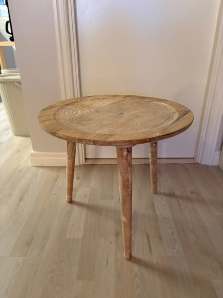 Runt bord i trä med snidade detaljer på bordsskivan. Bordet har tre ben.