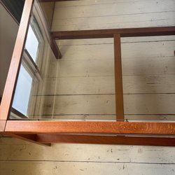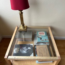 Soffbord i trä med en hylla. Bordet har en kvadratisk form och detaljerade kanter.Behöver renovera.