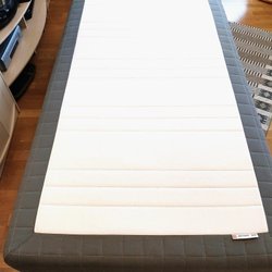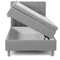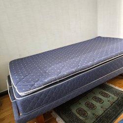Bekväm säng med ribbotten och ben. 120 cm. Har alltid haft en tunn madrass över som har skyddat sängen. Benen går att skruva loss. Hämtas i Göteborg. Lite fläckar längst ut på kanterna där madrassen inte har täckt.