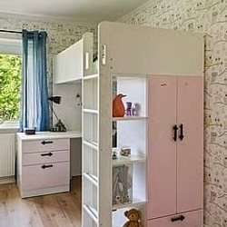 Loftsäng med ribbotten och grå sänghimmel. Perfekt för barnrummet eller studentlägenheten.