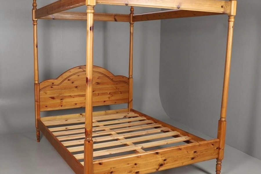 Himmelsäng liknande den på lånad bild. Har även lösa tunna skivor till tak om man vill, fyrkantiga raka hörnben. 180cm. Det ska ligga 2st 80cm resårmadrasser i och bäddmadrass, ingår inte.