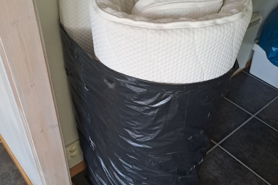 Bäddmadrass i vitt tyg med struktur. Madrassen är rullad och förpackad i en svart plastsäck.