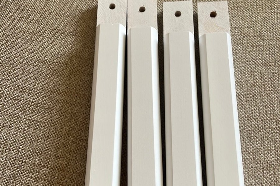 Möbelben i trä. Vita med en avfasad design. Varje ben har ett förborrat hål i toppen.