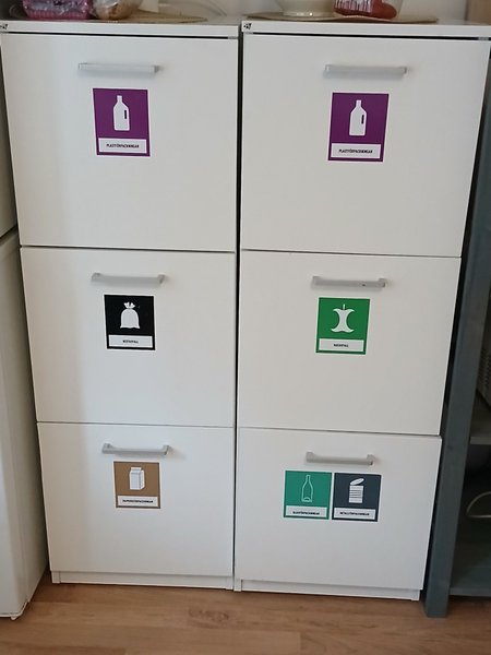 Praktisk sorteringsmöbel med lådor för olika typer av avfall: plastförpackningar, restavfall, matavfall, pappersförpackningar, glasförpackningar och metallförpackningar.