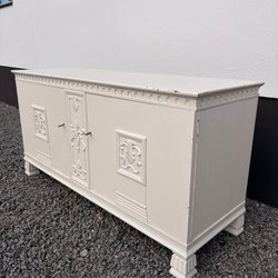 Skänk i ek med två dörrar och fyra lådor. Skänken har snidade detaljer och metallhandtag.