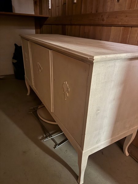Skänk i trä med tre dörrar. Skänken har snidade detaljer på dörrarna och böjda ben.