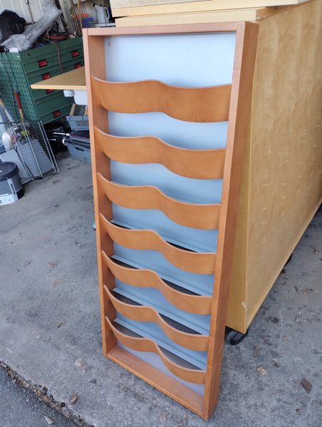 Tidningsställ med åtta fack. Tillverkat i trä med en ljusbrun finish och en ljusblå bakgrund.