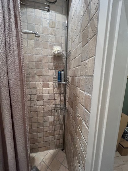 Duschhylla i bra använt skick. Behöver inte monteras utan endast spännas upp mellan tak och golv. Går att justera i längd.