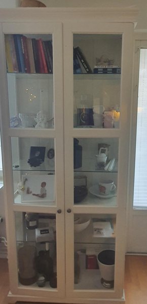 Vitt vitrinskåp med glasdörrar och hyllor. Perfekt för förvaring och visning av dina favoritsaker.