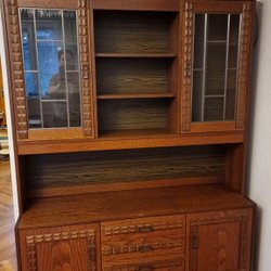 Mycket fint vitrinskåp i massivt trä. Fina detaljer, speglar, glasskivor och spottar i innertaket. Kan även användas som bokhylla!