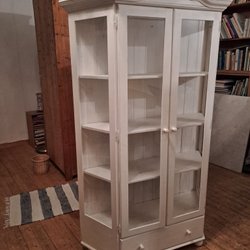 Ett charmigt vitrinskåp med plats för förvaring. Skåpet har både skåp och lådor. Mått H 2 m . B 120. D 45. Målat i färgen Fusion Elmwood ( kvalitetsfärg ) Betalning sker efter auktionens slut. Mail vid fler frågor mm