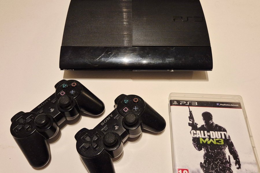 PlayStation 3 Super Slim konsol tillsammans med två handkontroller och spelet Call of Duty Modern Warfare 3.
