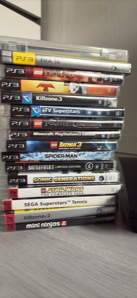 Säljer en samling av PS3-spel. Inkluderar titlar som FIFA 10, LEGO Lord of the Rings, Killzone 3, TV Superstars, LEGO Pirates of the Caribbean, Minecraft: PlayStation 3 Edition, LEGO Batman 3, Spider-Man, Battlefield 3 Limited Edition, Sonic Generations, LEGO Star Wars The Complete Saga, SEGA Superstars Tennis, Killzone 2 och Mini Ninjas.