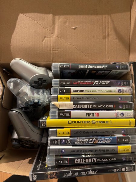 Säljer en samling PS3-spel. Inkluderar titlar som Grand Theft Auto V, Need for Speed Hot Pursuit Limited Edition, Call of Duty Modern Warfare 3, Gran Turismo 5, Call of Duty Black Ops II, FIFA 16, Counter-Strike 1 Anthology, Call of Duty 4: Modern Warfare, Shift 2 Unleashed Limited Edition, Call of Duty 4: Modern Warfare, Call of Duty Black Ops och Beautiful Creatures (DVD).