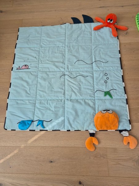 Denna lekmatta har ett havstema med en krabba, en bläckfisk och en fisk. Mattan är blå med svarta och vita ränder längs kanterna