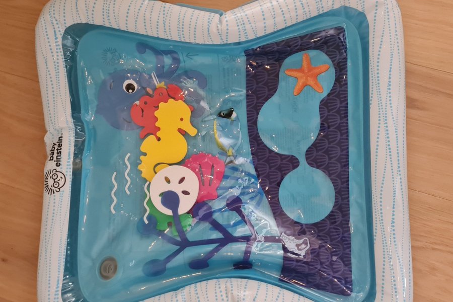 En vattenfylld lekmatta från Baby Einstein. Mattan är utformad för magträning och innehåller flytande sjödjur som sjöhästar, fiskar och sjöstjärnor. Den har en blå och vit design med mönster och erbjuder sensorisk stimulans.