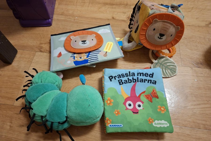 Ett set med babyleksaker innehållande en mjuk babblarnabok, en mjuk aktivitetskub med djurmotiv, en tygbok med lejonmotiv och en mjuk larv.