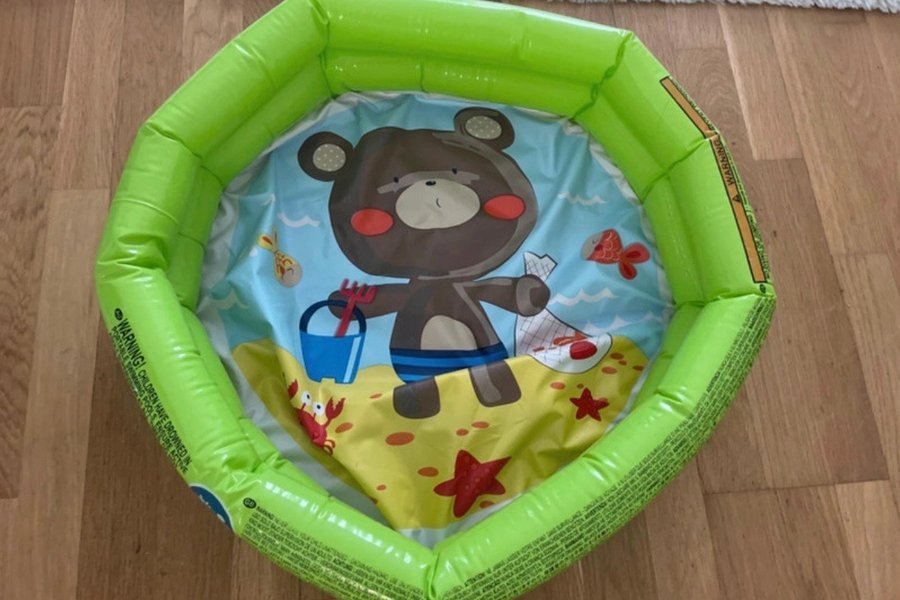 En uppblåsbar barnpool med ett färgglatt motiv av en björn på en strand. Den är lämplig för små barn. 50cm knappt använt som ny