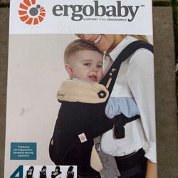 Ergobaby bärsele i svart med originalkartong, instruktions-DVD och broschyr. Selen har en justerbar huva och flera spännen för att anpassa passformen. Perfekt för att bära ditt barn bekvämt och säkert.