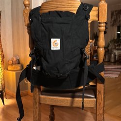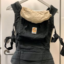 Ergobaby bärsele i svart och beige färg. Den har justerbara remmar och ett vadderat midjebälte för komfort.