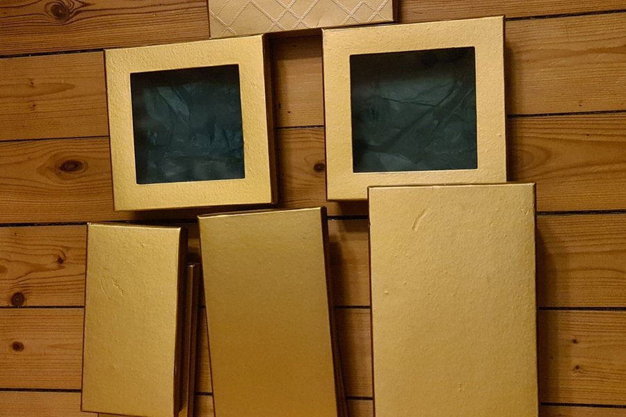 9 guldfärgade presentaskar i kartong, olika storlekar.