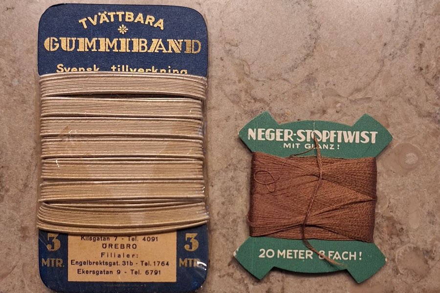 Gummibandsförpackningen är oöppnad från 1940-talet. Stoppgarnet är i princip oanvänt.