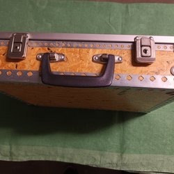 En klassisk syskrin i trä med handtag. Den har flera fack som kan fällas ut för att ge bra överblick och förvaring av sytillbehör.