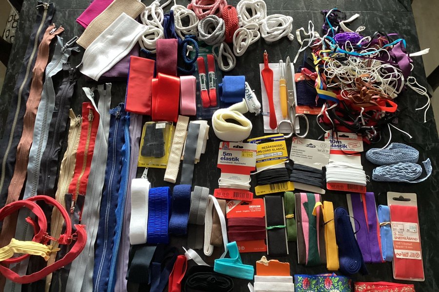 Ex: blixtlås i olika färger och längder, muddtyg, snoddar,sidenband, ribsband, gummiband olika bredder, snedslånand, garneringsband, spets, blandad påse med smala band, sax, trådsprättare ”sporre”.