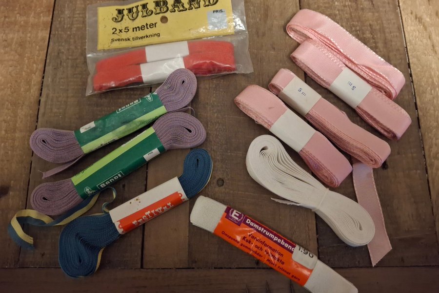 11 olika förpackningar med band såsom sidenband, bomullsband, dekorband, julband, resårband. Alla är nya förutom en av de rosa sidenbanden, obetydligt använd.