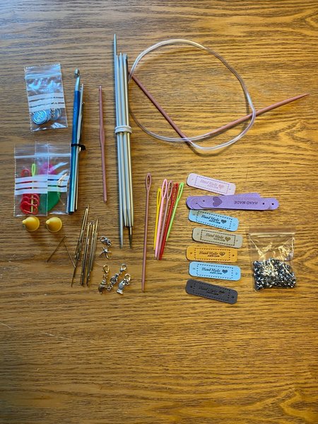 Ett paket med strumpstickor,rundsticka nr 4 i plast, nålar, nålpåträdare,stickmarkörer, nitar,hand made lappar,virknålar i olika storlekar mm