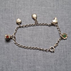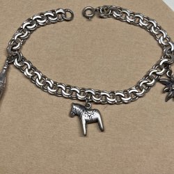 Ett trevligt armband med 8 berlocker i silverfärgade nyanser. 18 cm, reglerbar längd. Bra använt skick.