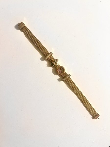 Ett elegant Pandora armband i roséguldpläterat rostfritt stål. Armbandet har en meshdesign och är 16 cm långt med ett säkert spänne. Det har fyra berlocker, varav 3 med zirkoner. Använt ett fåtal gånger.